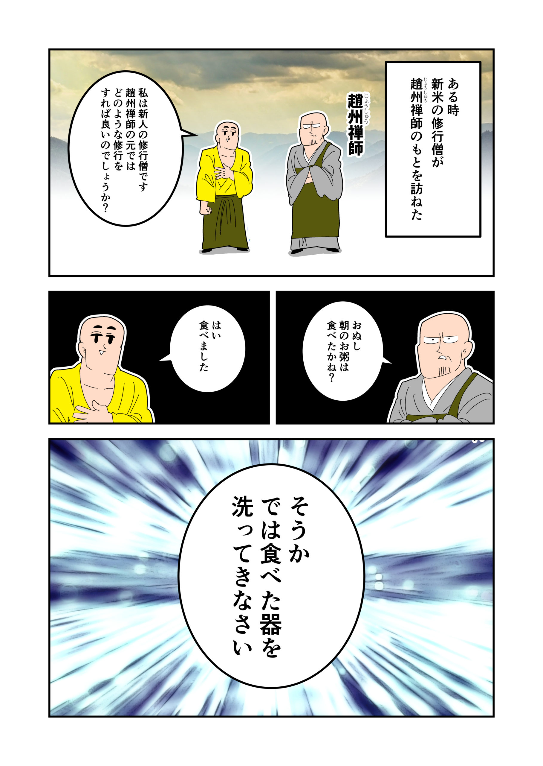 趙州禅師は「そうか、では食べた器を洗ってきなさい」と言った【疑わず言うとおりにしろよ】。