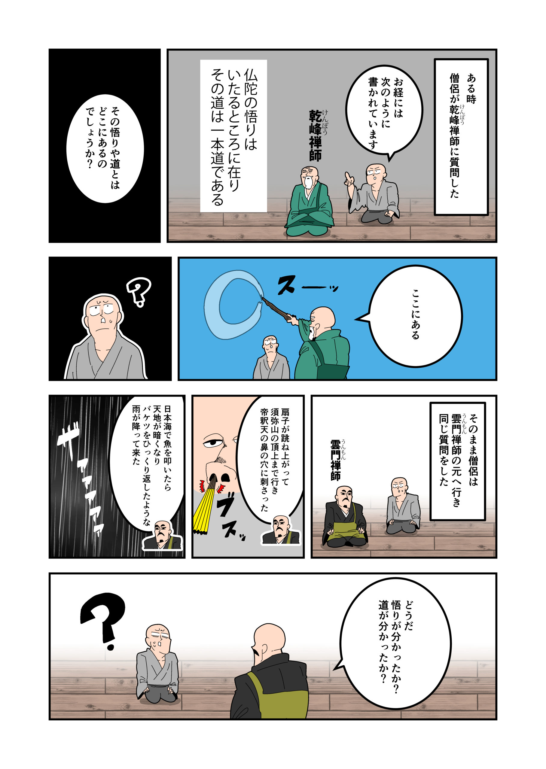 さらに続けて「日本海の海で魚を叩いたら天地が暗くなり、バケツをひっくり返したような雨が降って来た。どうだ悟りが分かったか?道が分かったか?」【どのような説明を聞こうとも理解できるわけがない】。