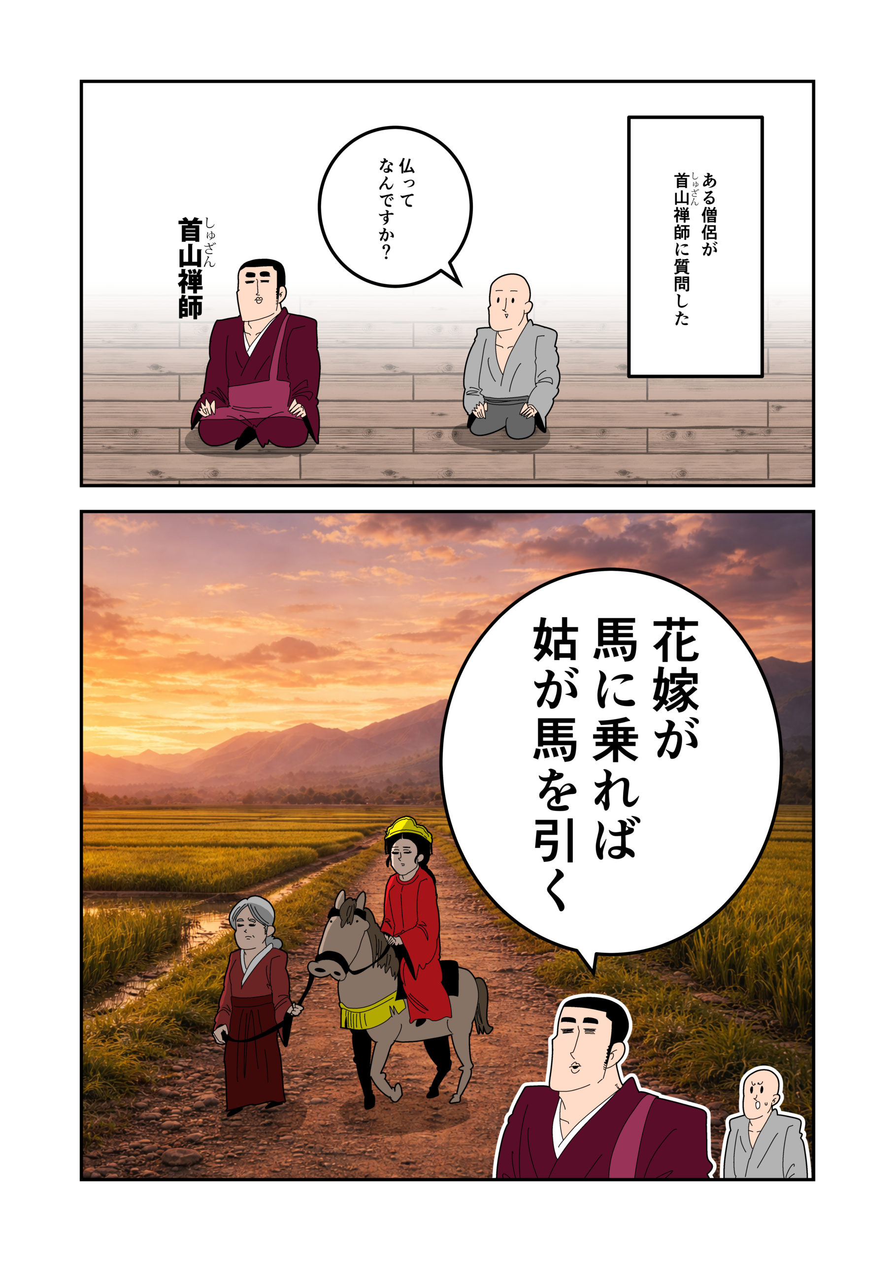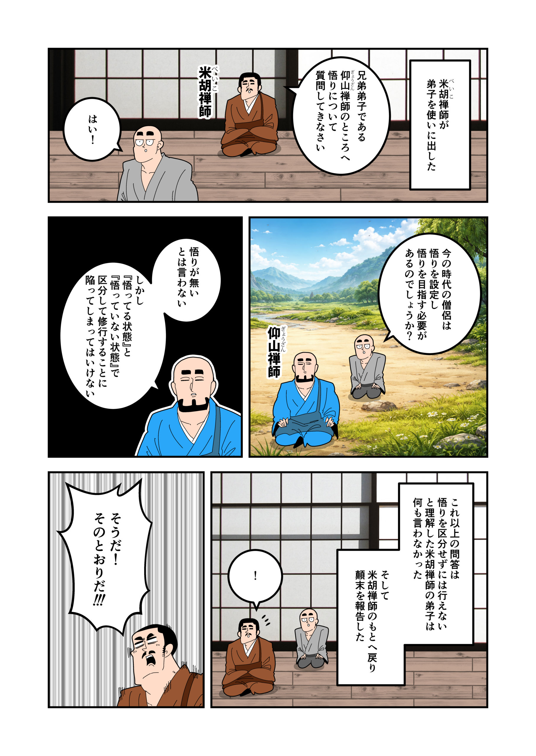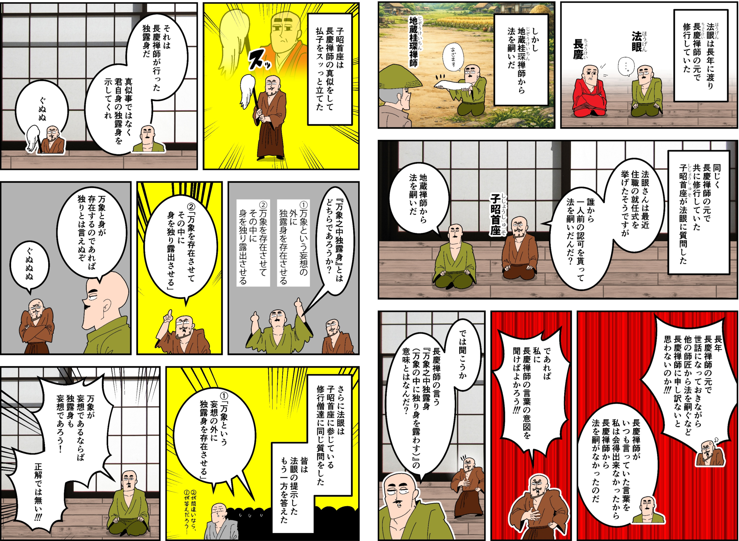 進山主は「あちらが監院(事務長)の部屋で、あちらが典座(料理長)の部屋だ。どうだ!分かったか!!」【意外な答えを言った】。