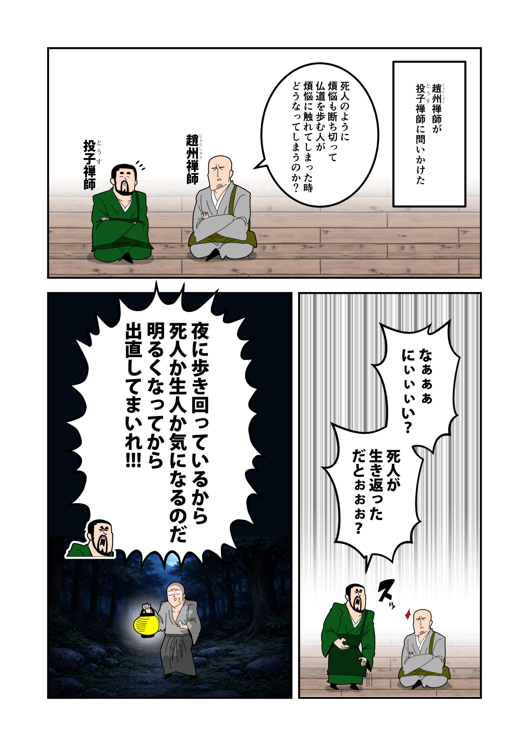 進山主が脩山主に質問した。「『空』だ『不生不滅』だという内容のお経を読み、意味を理解しても実際は目の前の自分の人生に執着し、死を恐れてしまう。仏法として、執着は良くないと理解しても、生活の上で何の役にも立たない。いったいどうしたら良いのだろうか?」【鋭い質問だ、油断するな!!】。
