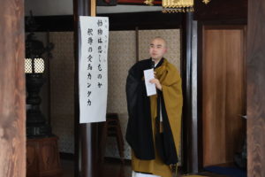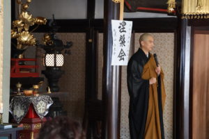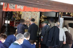涅槃図を飾り、「遺教経(ゆいきょうぎょう)」というお釈迦様の遺言のお経をお唱えし、追悼、報恩いたしました。
